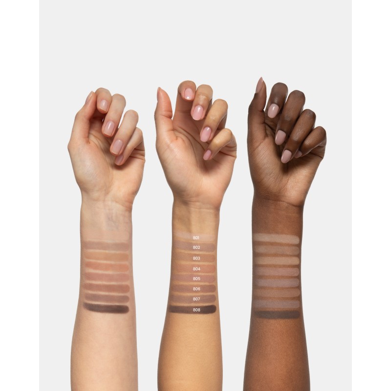 La gamme se compose de huit teintes, dominées par des beiges, des tons chauds et des bruns profonds.